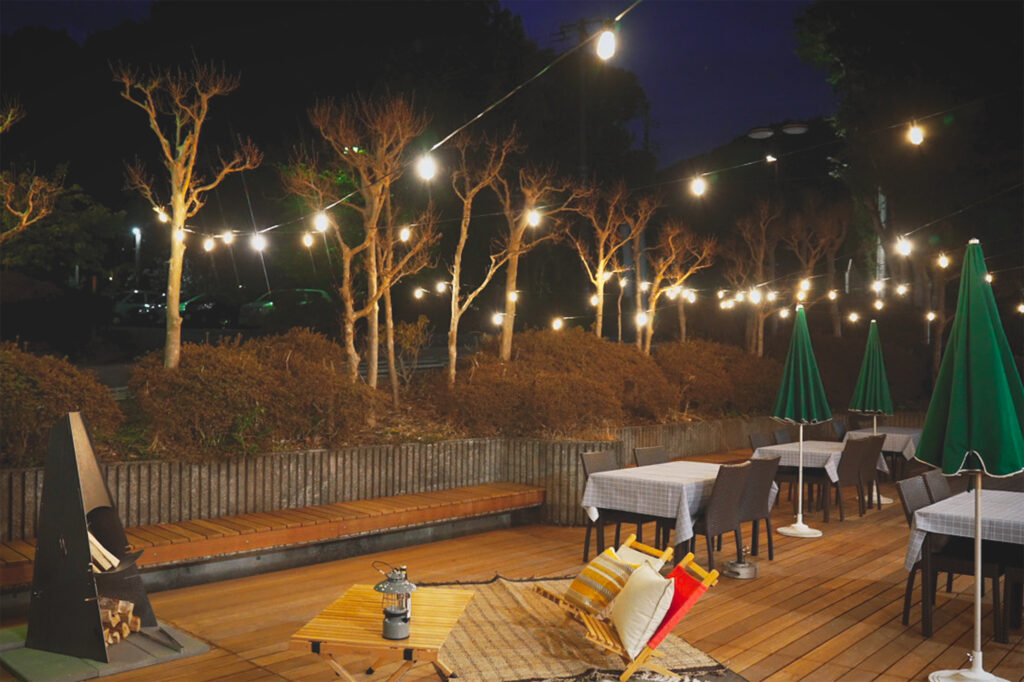 施設には新たにデッキ空間を整備。昼は森の気配を感じながらくつろぎ、夜は照明と焚火がやさしく空間を包みます。写真を撮りたくなる象徴的な場所で、滞在のメインビジュアルとなるスポットです。※焚火は当面の間、土休日の18時~20時まで(天候などで予告なく中止や変更になる場合があります。)